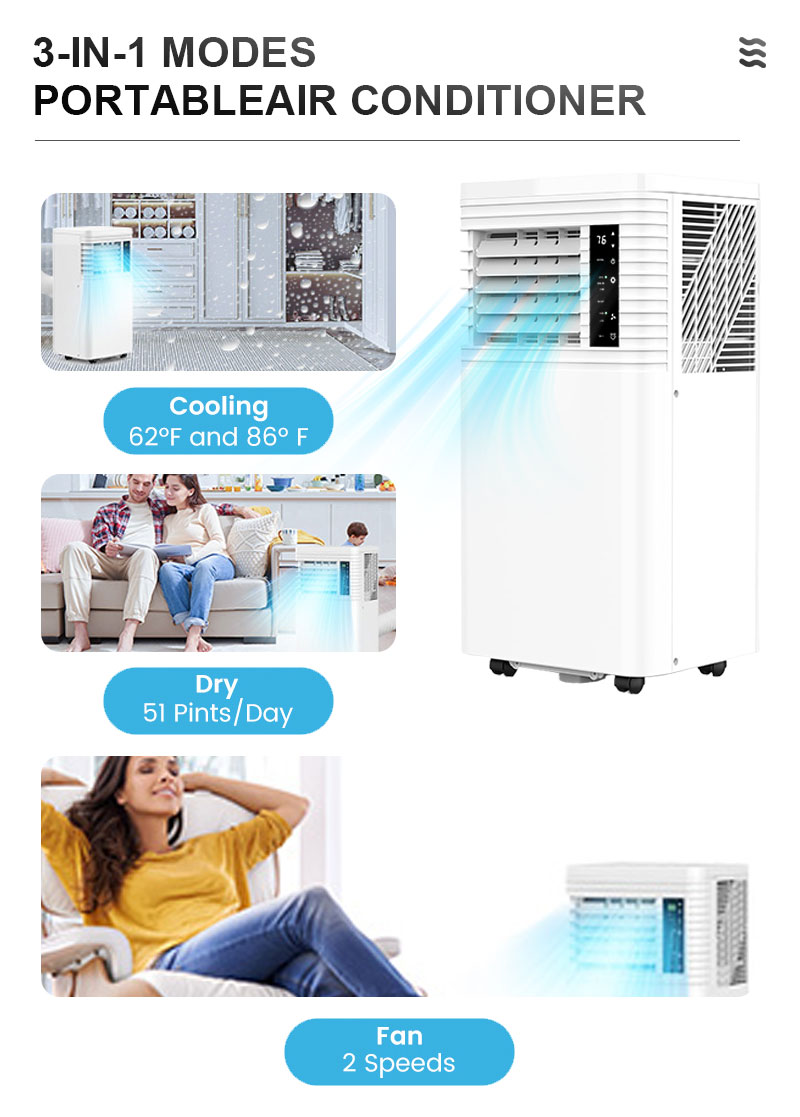 3-in-1 Modes &24h Timer: 8,000 BTU (ASHRAE) portable air conditioner combines Fan, Cooling and Dehumidifier modes. Fast and effective cooling rooms up to 350 Sq.Ft.Temperature between 62°F-86°F. In fan mode, the fan circulates the air in the room. Dehumidifier mode is perfect for humid and rainy days.